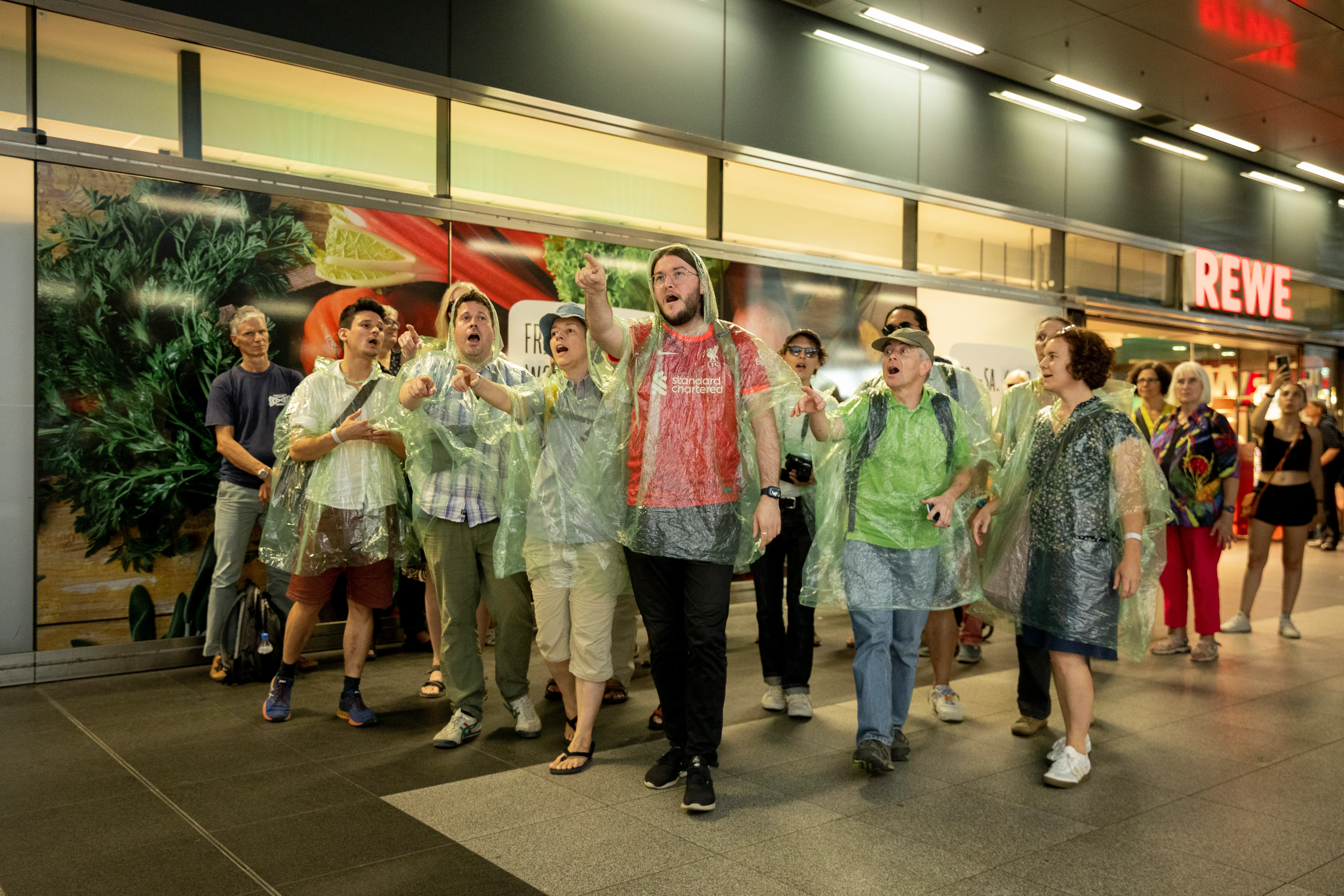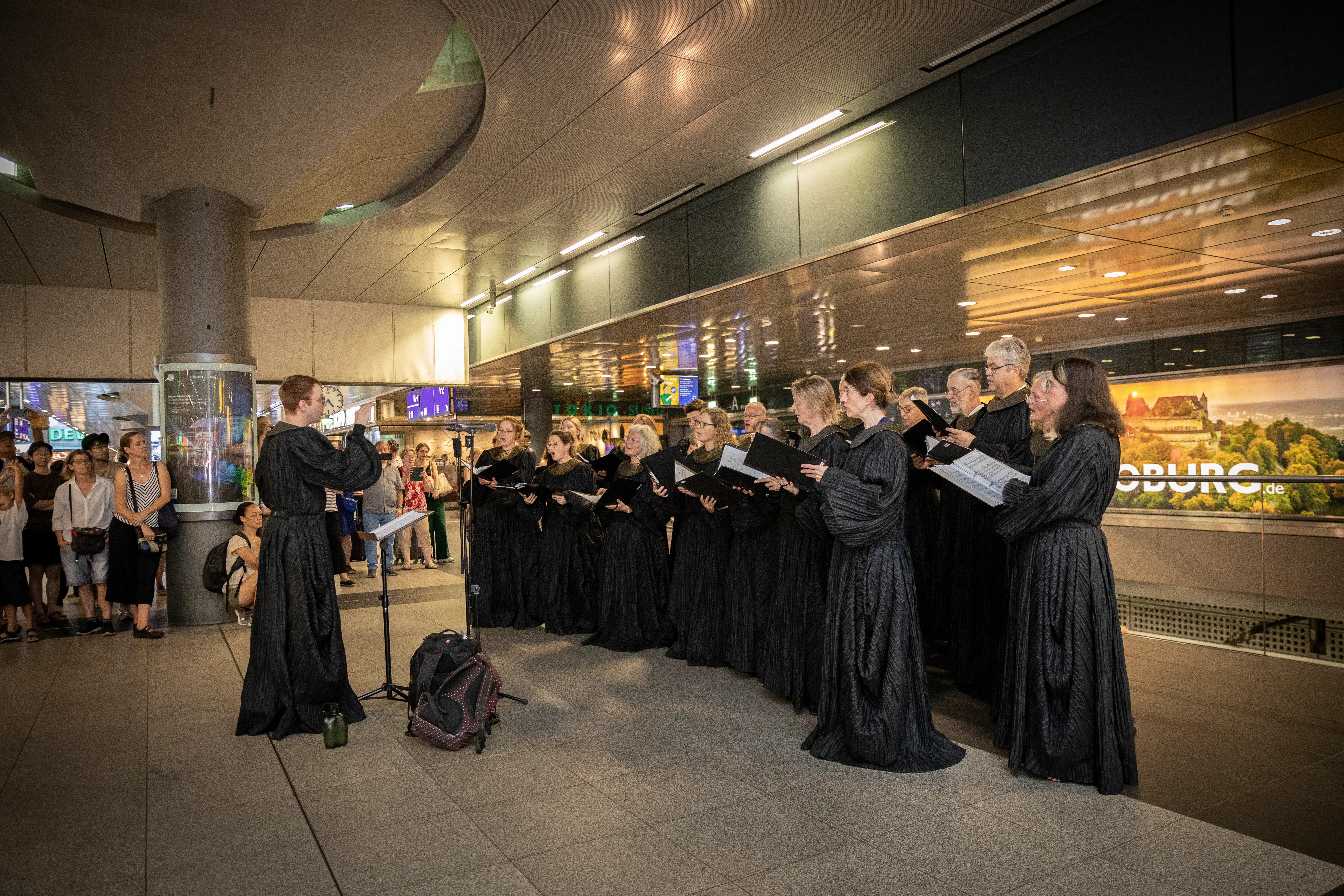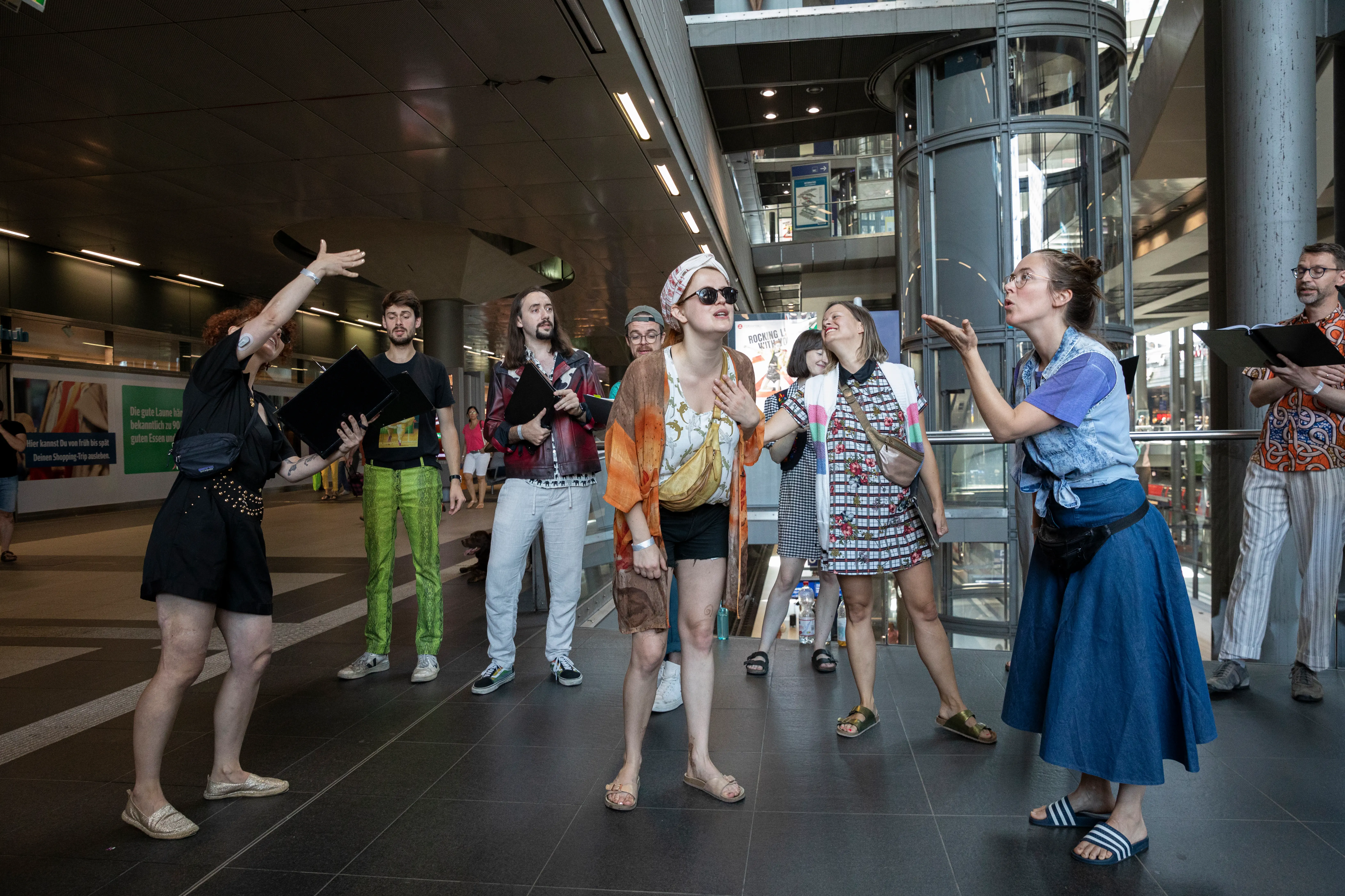 Auf dieser „Bühne des Alltags“ haben wir am Sonntag, den 10. September 2023, von 12 Uhr bis 18 Uhr 11 Chöre aus Berlin inszeniert, die mit unterschiedlichsten Liedern der klassischen Chorliteratur in den alltäglichen „Bahnhofssound“ eingriffen. Die Chöre waren soweit es ging wie die Reisenden in Bewegung, dabei war jeder Chor herausgefordert, sich mit dem Sound des Bahnhofs auseinanderzusetzen.