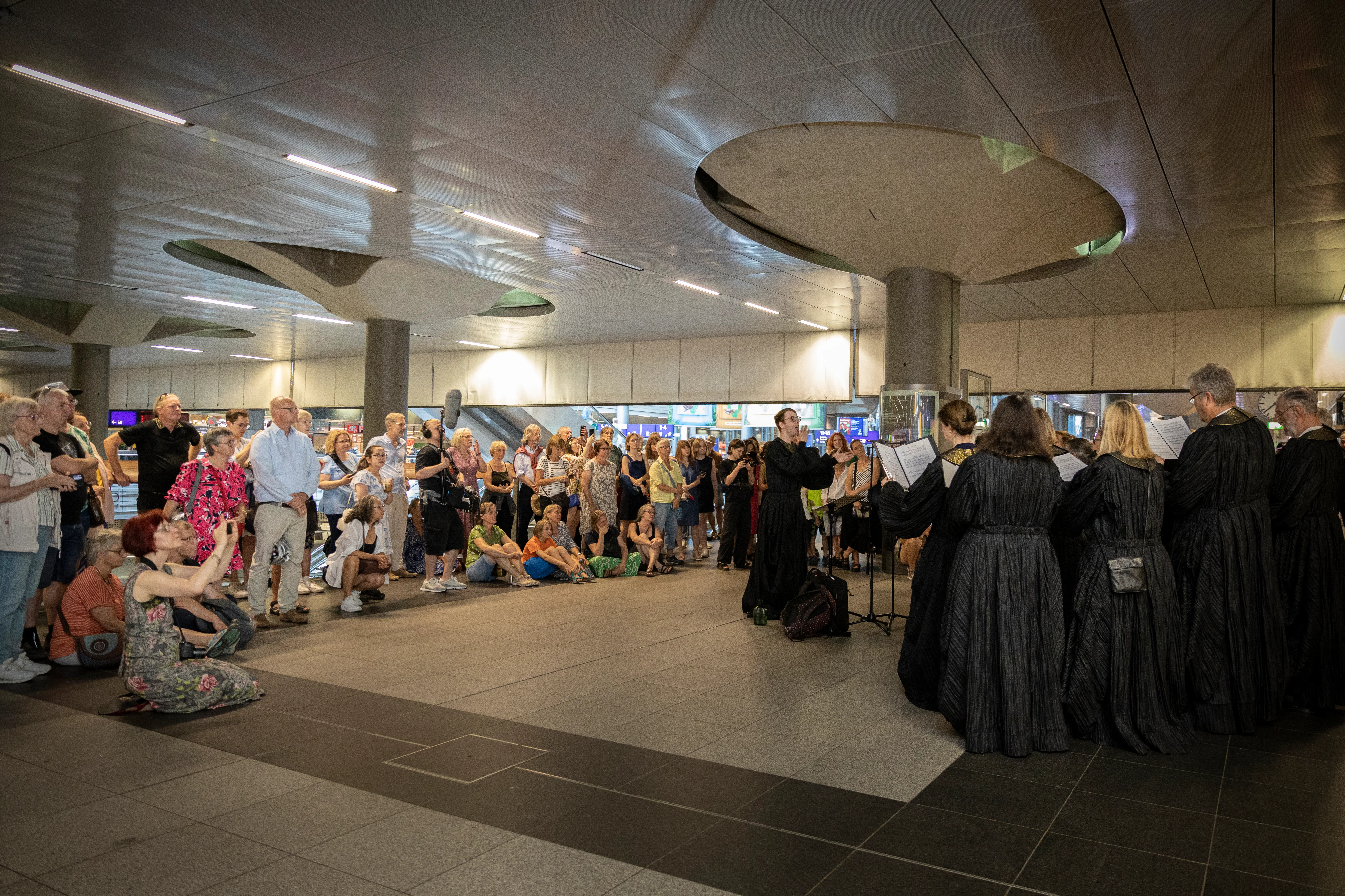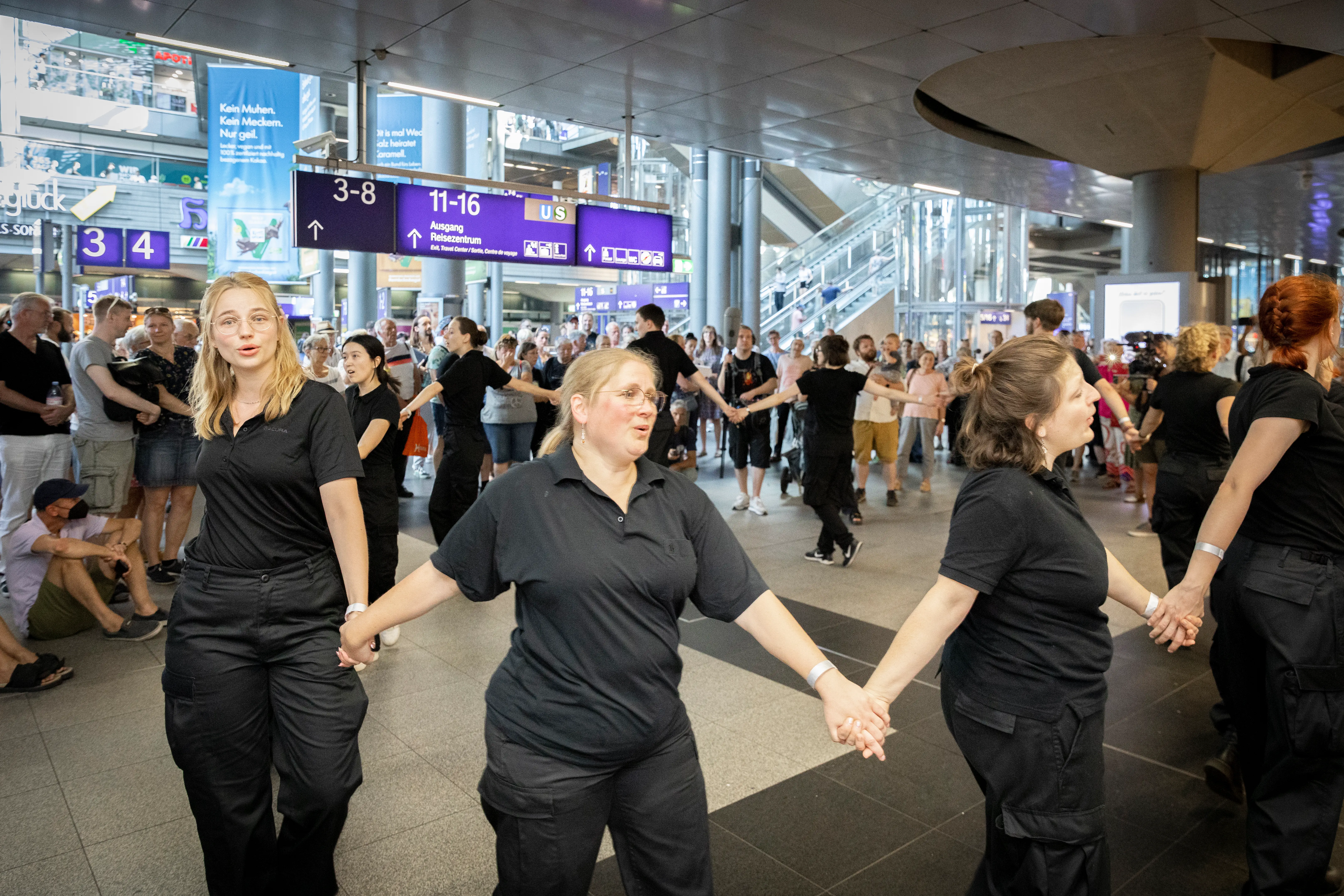 Innerhalb des auf sechs Stunden angelegten Events kam es zweimal zum Höhepunkt, als sich alle 11 Chöre im Bahnhof versammeln und gemeinsam mit der Power von über 250 Stimmen in das alltägliche Geschehen eingriffen.